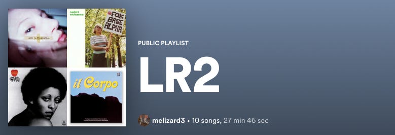 Four weeks have flown by since LR1, and in that time I’ve added around 100 songs to my “latest” playlist. While that more or less checks out with my typical listening habits, I can attribute a lot of those songs to my coming down with covid (for the first time ever!) last month. I spent a big chunk of my isolation period listening to music—specifically, investigating albums that I’d thus far neglected to explore beyond the few songs I already knew off of them. Saint Etienne’s Foxbase Alpha, The Clientele’s Strange Geometry, and 800 Cherries’ Romantico were all highlights, and all made it on to today’s installment of LR. Albums that didn’t make the cut but that are worth a mention include SPIRIT OF THE BEEHIVE‘s Hypnic Jerks, The Breeders’ Last Splash, Free Cake For Every Creature’s The Bluest Star, and Lil Yachty’s Let’s Start Here.