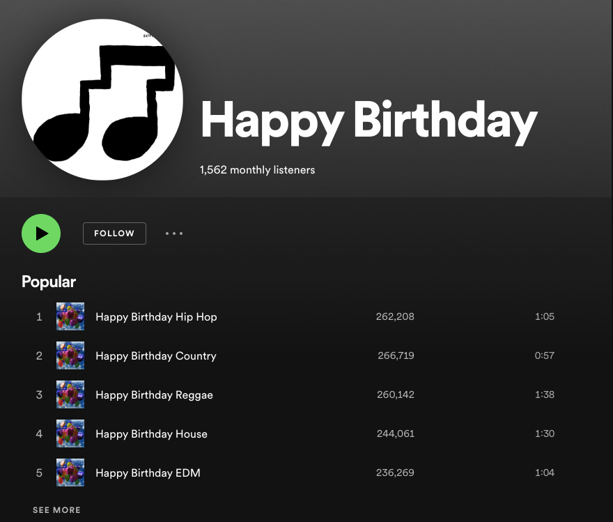 Kyle Thomas of King Tuff leads this short-lived 2010 project that unfortunately shares a Spotify page with the innumerable versions of “Happy Birthday” the song. I recommend checking their page out just so you can peruse the amount of albums dedicated to versions of “Happy Birthday” (including but not limited to “8 Birthday Fun Singalong,” “8 The Top Birthday,” “8 Happy Birthday One And All,” and “12 Birthday For A Friend”).